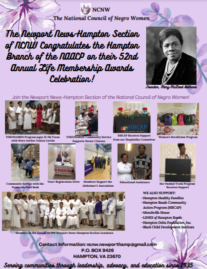 The Newport News-Hampton Section holds its General Membership meeting on the fourth Monday of each month at 6 PM, via Zoom and/or in person at the Hampton Delta Foundation building.